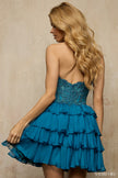 Strapless cocktail dress with lace corset bodice and chiffon ruffle skirt.