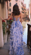 Strapless gown with leaf lace corset bodice, floral chiffon ruffle skirt with slit, and a lace up back.