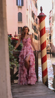 Strapless chiffon gown with bow and ruffle skirt with slit.