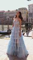 Strapless chiffon ballgown with corset leaf lace bodice and chiffon ruffle skirt.