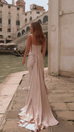 Fitted stretch satin gown with corset bodice and bead embellishments.