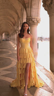 Strapless hot fix A-line gown with corset bodice, ruffle skirt, lace up back, and a skirt slit.