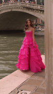 Strapless ballgown with corset bodice, chiffon ruffle skirt with slit, and bead embellishments.