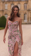 Fitted strapless floral beaded gown with corset bodice and skirt slit.