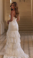 Strapless lace mermaid gown with corset bodice and lace ruffle skirt.