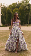 Strapless floral gown with chiffon ruffle skirt.