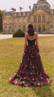 Strapless gown with satin corset bodice and a floral chiffon ruffle skirt.