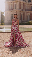 Strapless floral gown with corset bodice.