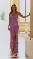 Fitted sequin fitted dress with side-cuts, an open back with skirt slit.
