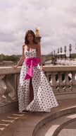 Strapless polka dot A-line gown with bow on side and a skirt slit.