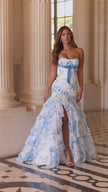 Strapless mermaid floral gown with chiffon ruffle skirt.