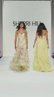 Strapless floral mermaid gown with chiffon ruffle skirt.