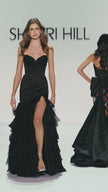 Strapless stretch fitted ruched gown with lace ruffle skirt slit and lace up back.