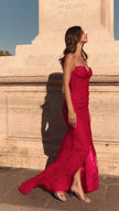 Strapless fitted leaf lace gown with corset bodice and skirt slit.