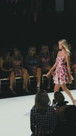 Floral cocktail gown with corset bodice and pearl embellishments.