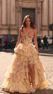 Strapless floral gown with beaded corset bodice and chiffon ruffle skirt.