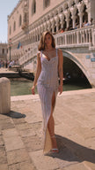 Fully beaded fitted gown with skirt slit and an open back with beaded drapes.