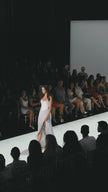 Strapless fitted gown with satin corset bodice and a pearl skirt.