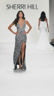 Fitted beaded gown with pearls, deep V neckline, and an open back.