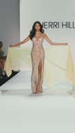 Fully beaded fitted gown with deep V neckline, beaded flower embellishments, skirt slit, and chiffon cape.